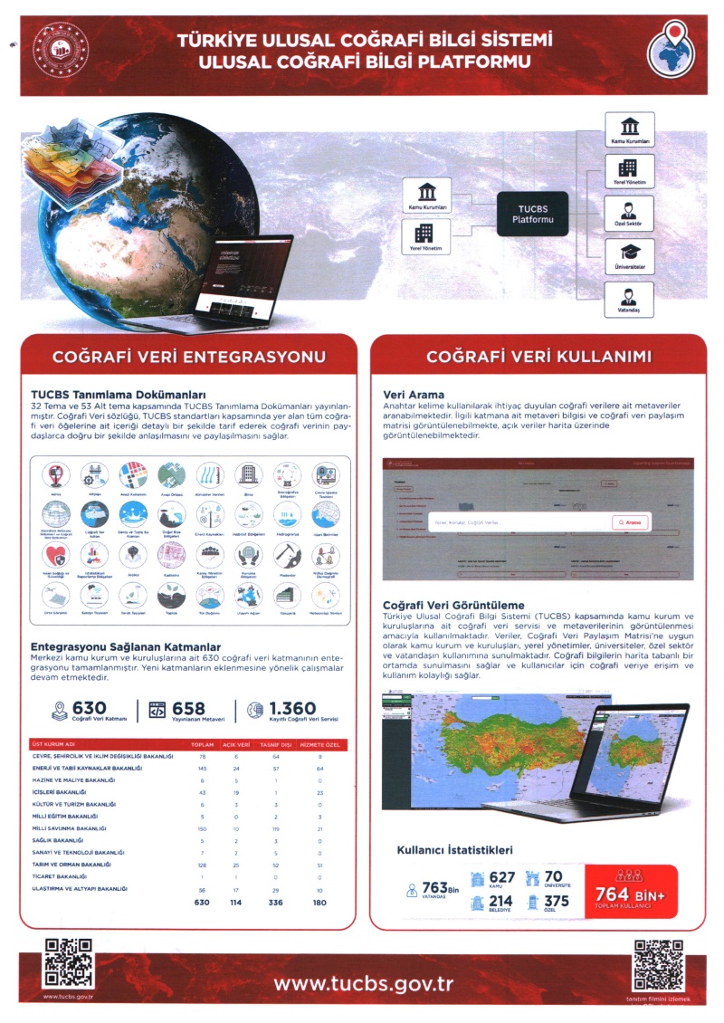 | Türkiye Ulusal Coğrafi Bilgi Sistemi çalışmaları kapsamında Türkiye' nin tüm coğrafi verilerini bir araya getiren ve e-Devlet Kapısı ile entegre bir yapıda tasarlanan Ulusal Coğrafi Bilgi Platformu' nun oluşturulduğu; bu platformun "Coğrafi Veri Görüntüleme, Metaveri Yönetim Portalı, Coğrafi Veri Talep Portalı, Coğrafi Veri Paylaşım Matrisi, Coğrafi Veri Sözlüğü, Coğrafi Açık Veri Portalı"ndan oluştuğu, söz konusu platform ile vatandaşlarımızın, özel sektörün ve kurumların coğrafi veri ihtiyaçlarının "tucbs.gov.tr" adresindeki coğrafi veri talep platformundan karşılanabileceği kamuoyuna duyurulur. |